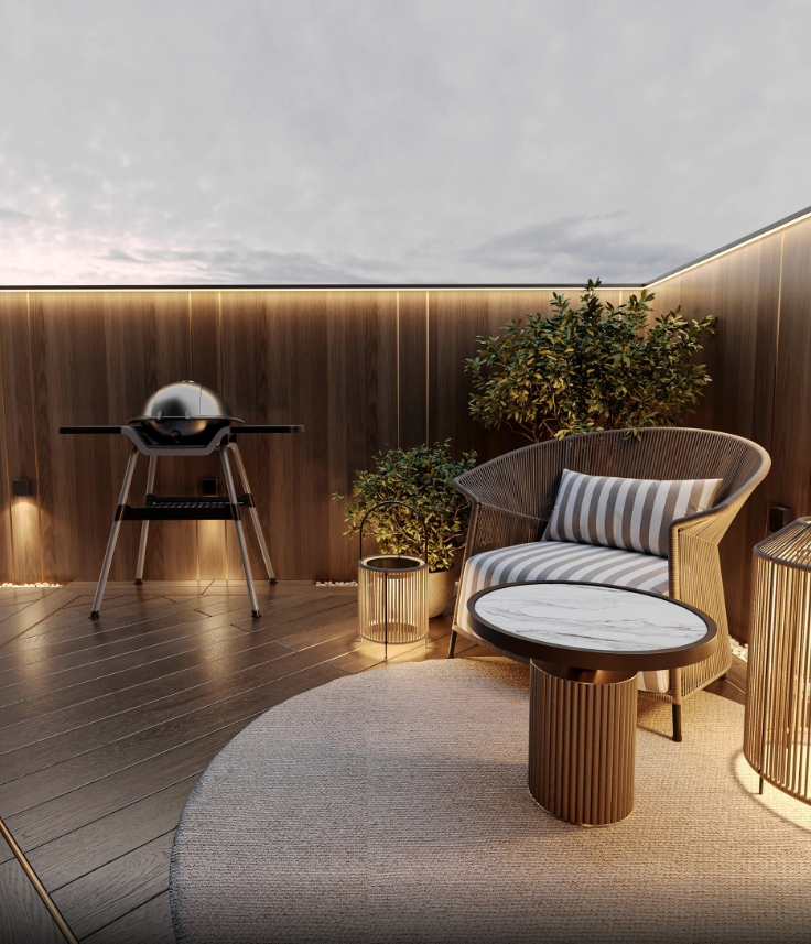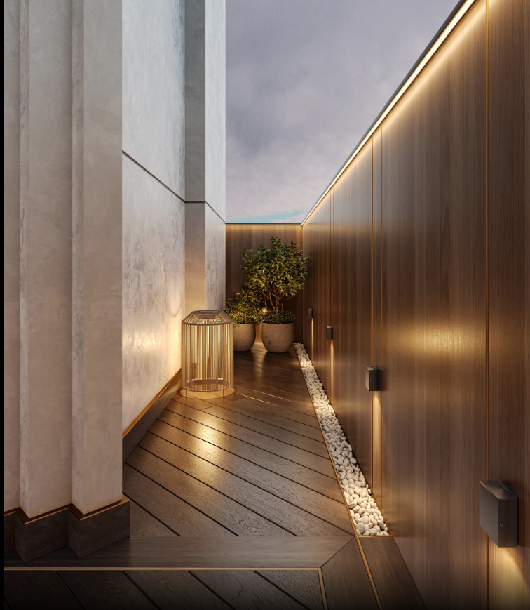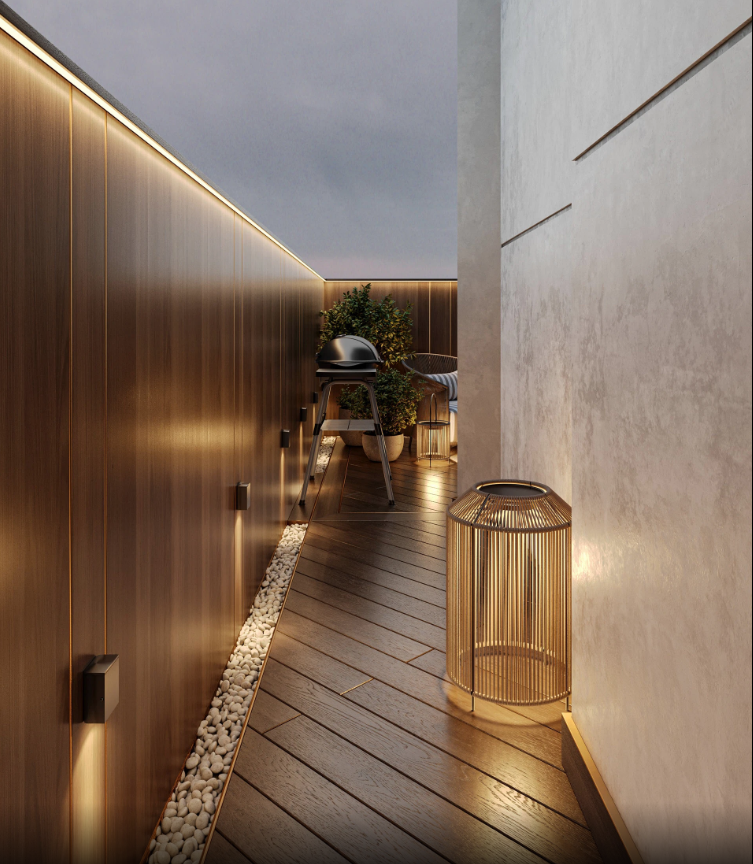 Architectural Texture: The vertical wood wall slats on the back wall provide a polished, hotel-style backdrop and make the outdoor area look more spacious, while also providing a sense of warmth.