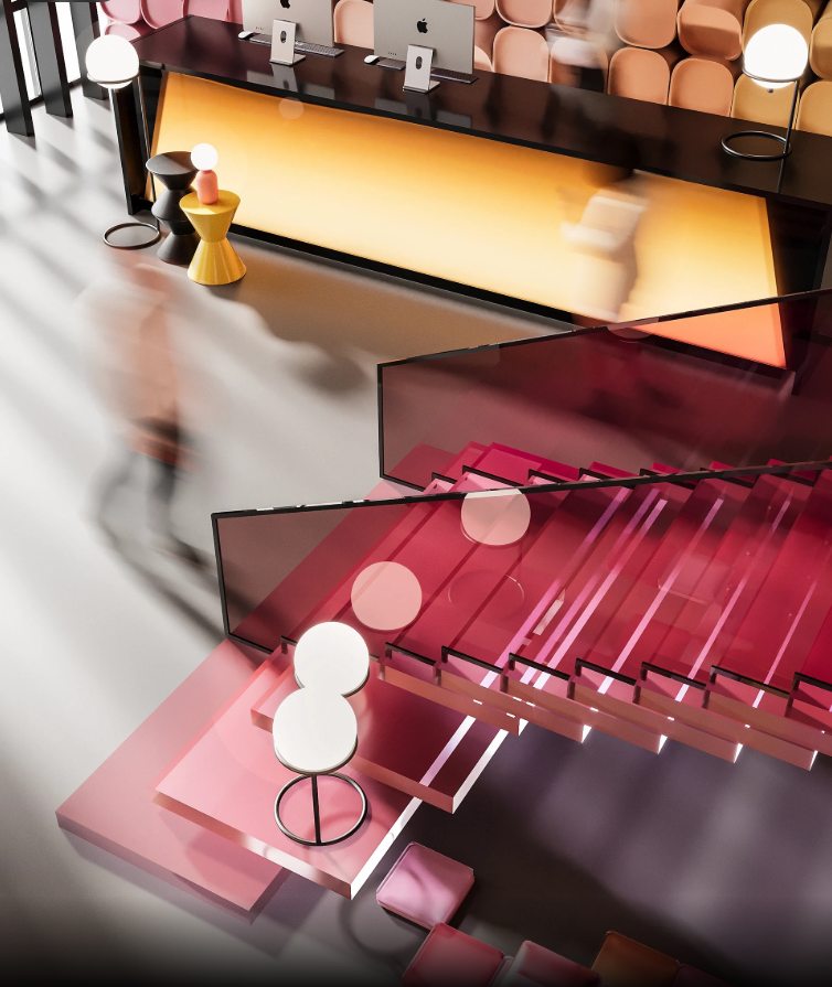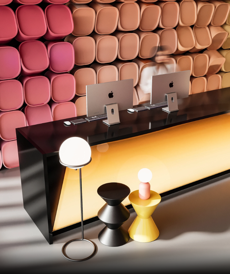 Cable Management: The grommets built into the desk and the interior conduits provide a clean look and keep the cables hidden, which enhances the technological appearance of the store.