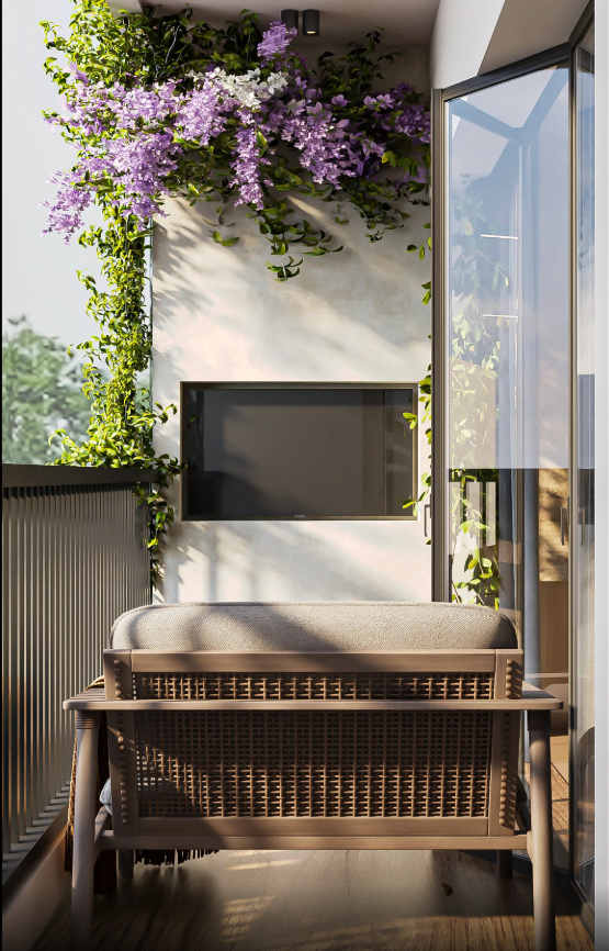 Technology Built-in. The balcony includes a weather- and rainproof, recessed, wall-mounted television, allowing it to serve as an outdoor movie room and provide a peaceful outdoor experience in nature.