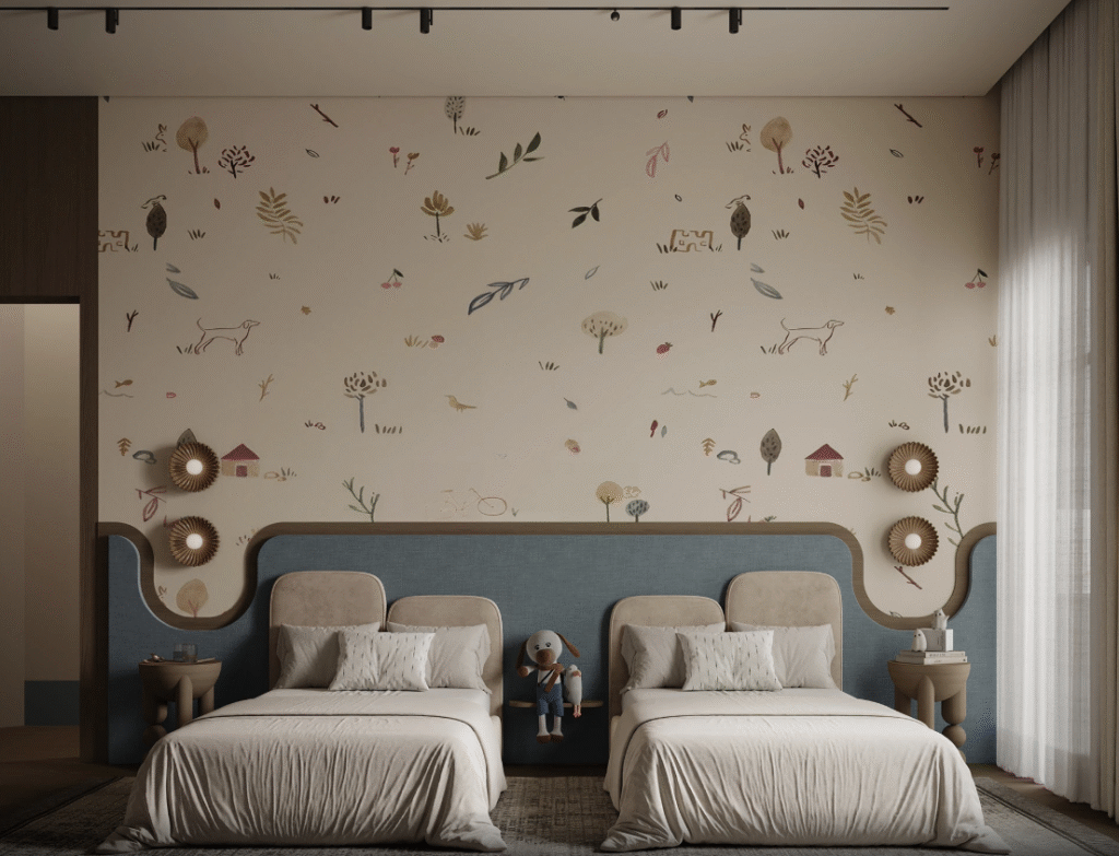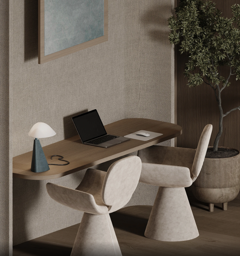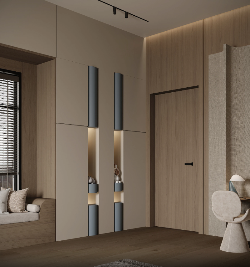 Wall Detail: Vertical Wood-Slat Paneling paired with Smooth Concrete-look Finish