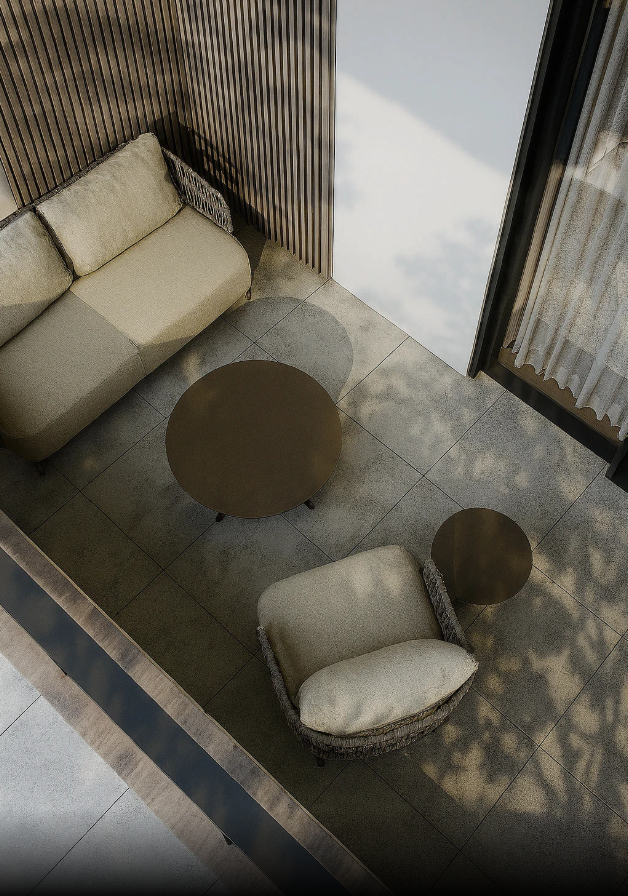 Balance of Natural Elements and Modern Design – The combination of bronze tones and textured weaving provides an attractive balance with the outdoor environment, while the vertical wood-slat wall panels add a high-end architectural accent.