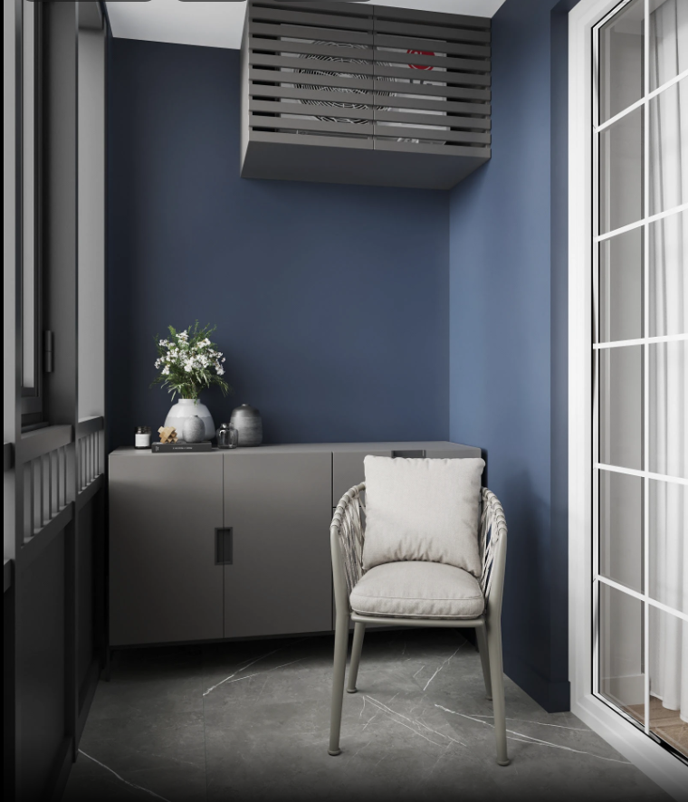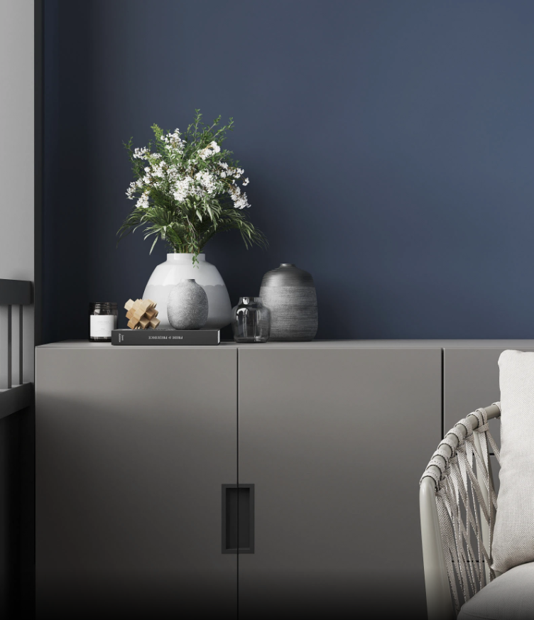 Strong Contrast: The dark navy blue wall provides a dramatic, elegant, and sophisticated feel for the room, especially with the light-colored furnishings and natural wood accents.