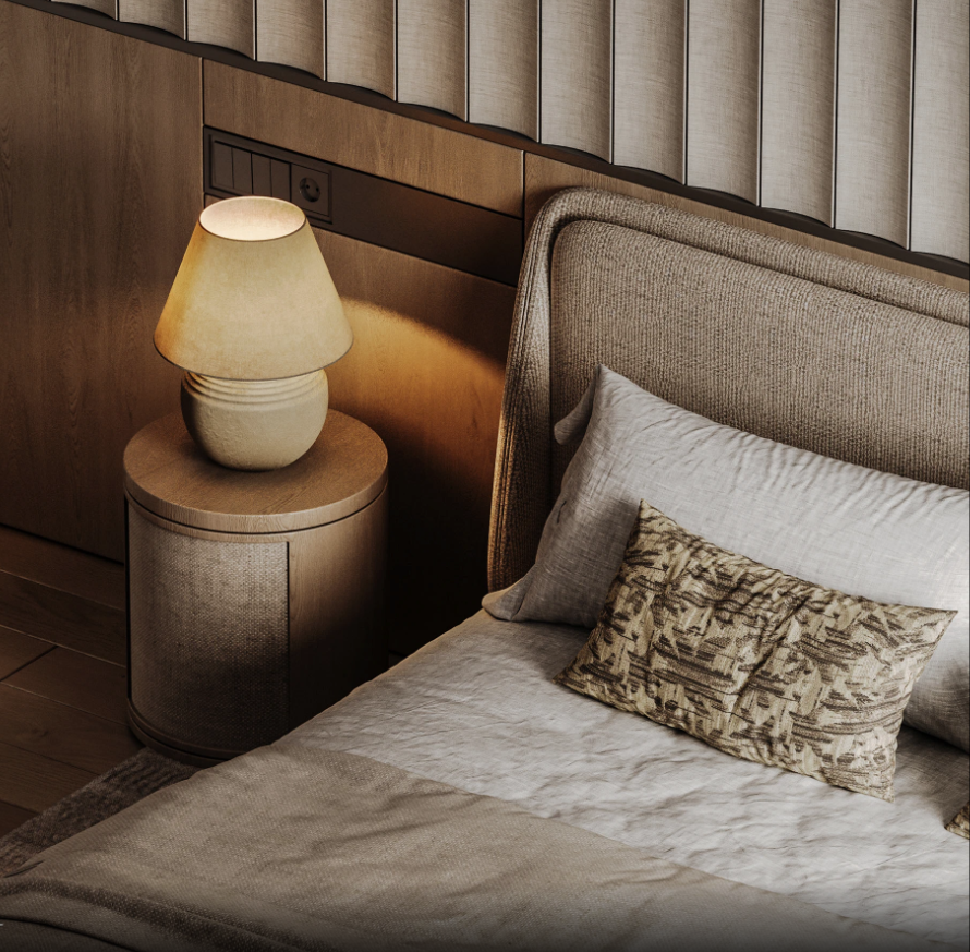 A luxurious atmosphere is created by the addition of an accent wall made from vertical wood slats, which provide architectural height and warmth to create an atmosphere reminiscent of a luxury hotel.