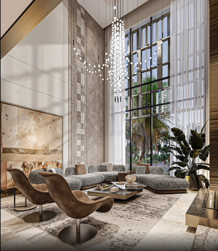 Contrasting Textures—The combination of soft fabrics and hard fluted panels on the wall creates a large view of the room and a unique tactile element to the room. This combination visually enhances the overall aesthetic of the room.