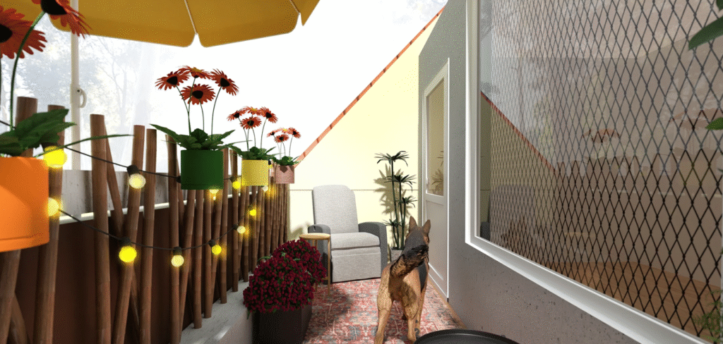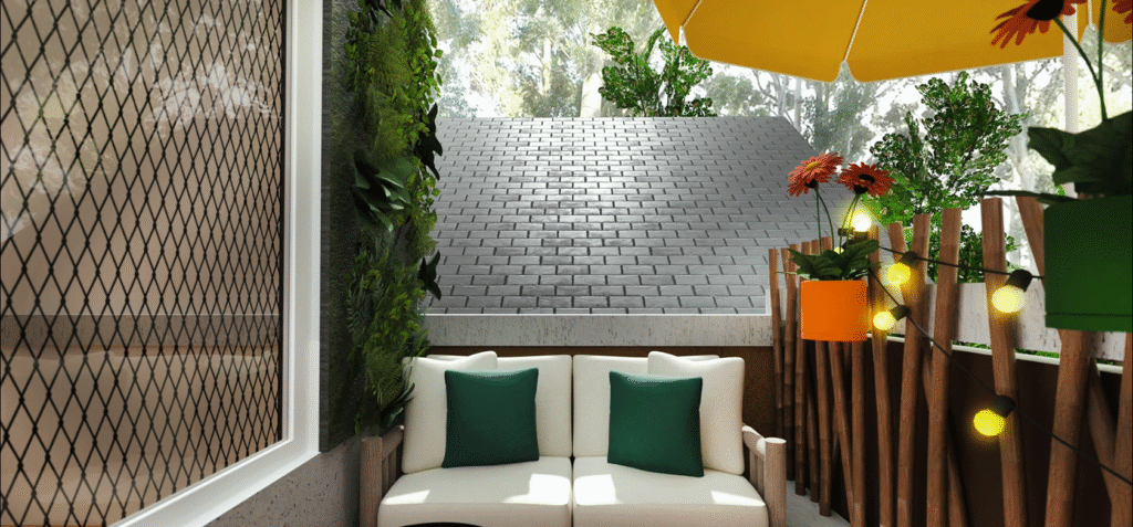 The use of bamboo-stick privacy screens creates an organic/textured, light-filtered/secluded boundary between the home and neighbours.