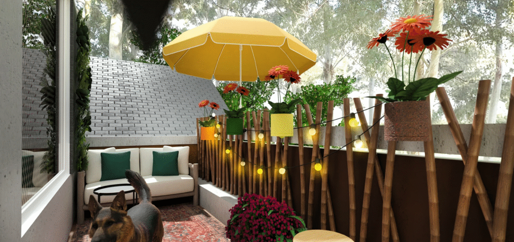 A large yellow sun umbrella along with festive string lights provides an easy transition from bright daylight shade to an inviting, warm evening glow.