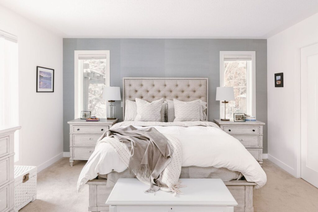 A classic combination that never goes out of style, white and soft grey create a serene and sophisticated bedroom.